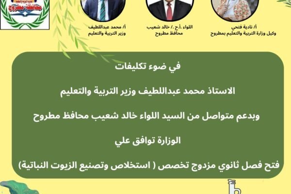 كتب محمد السيد أعلنت نادية فتحي وكيل وزارة التربية والتعليم خبرا سارا جديدا لأهالي مطروح بموافقة الادارة العامة للتعليم المزدوج التابعة للتعليم الفني بالوزارة على فتح تعليم مزدوج تخصص ” استخلاص وتصنيع الزيوت النباتية ” وذلك للطلاب الحاصلين على الشهادة الاعدادية بمجموع 165 درجة. وقدمت وكيل الوزارة الشكر لمحمد عبداللطيف وزير التربية والتعليم تقديرا لدعمه…
